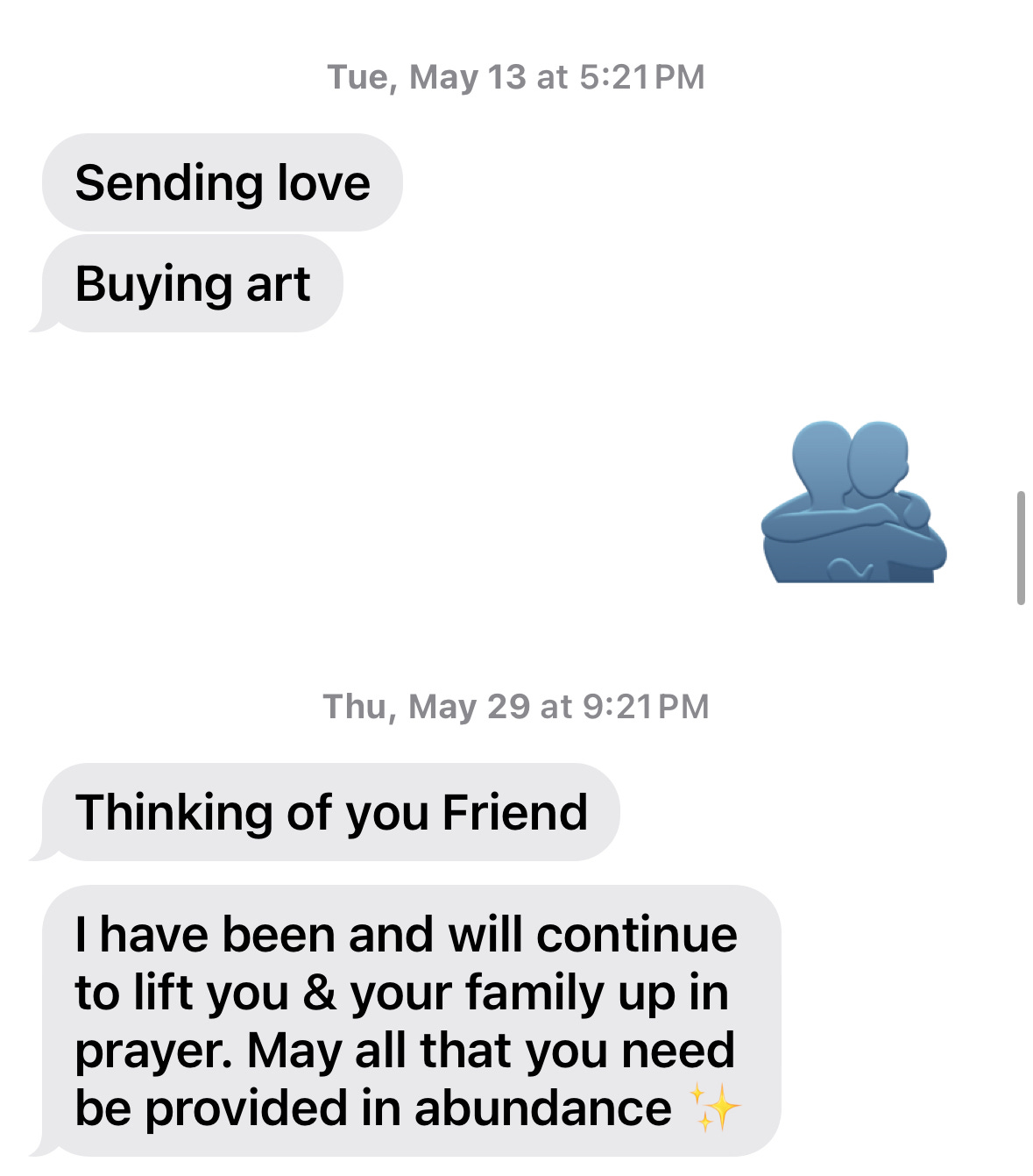 “If I don’t ask what someone needs, how will I know what they need?” Fair question. In this instance, for me, what helped was when people would offer what they already had. I had a sale on my website (a publicly stated way that people could help) and some folks reached out to tell me they were going to buy paintings, prints, and/or books.